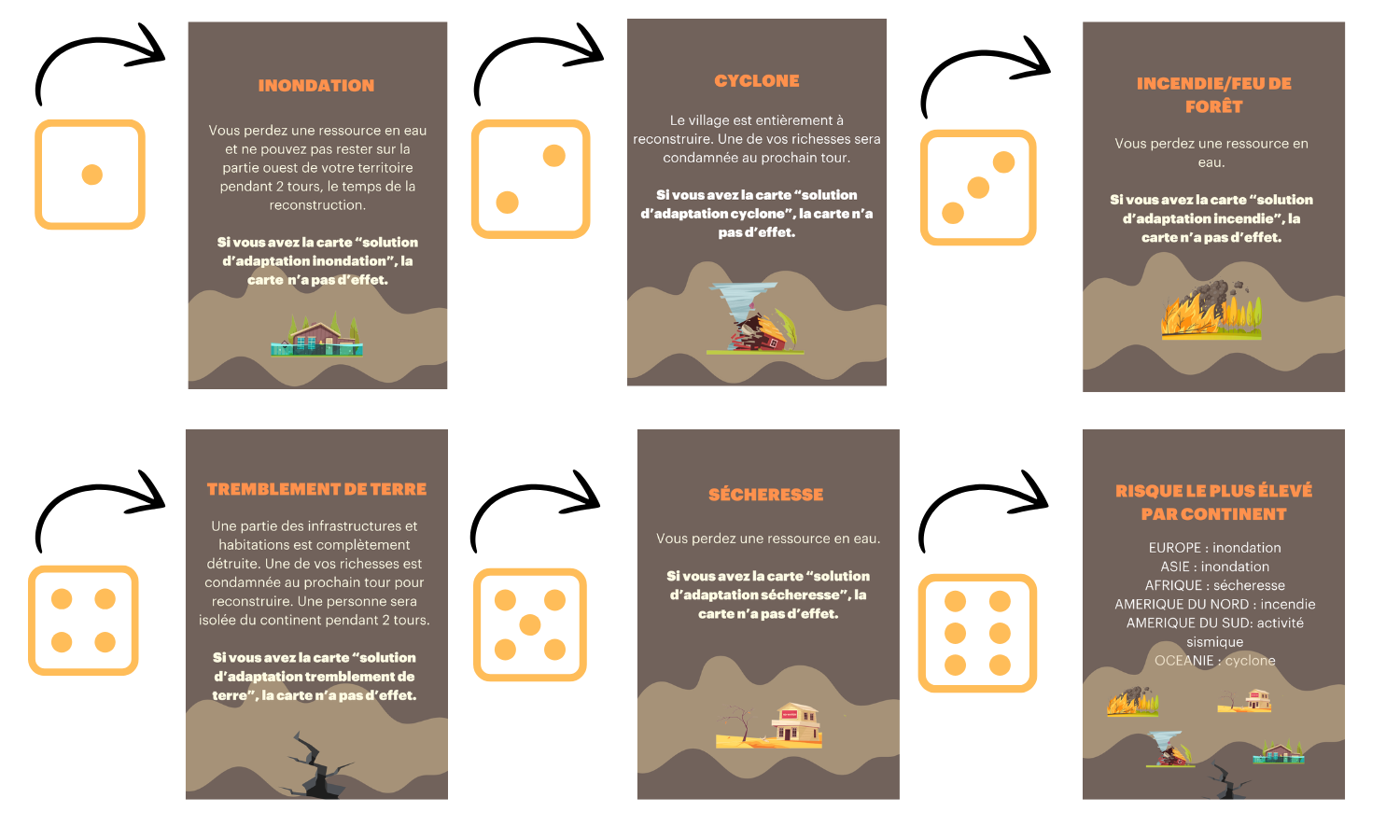 Au début du jeu, chaque continent fait face à une catastrophe naturelle, sans avoir de solutions d’adaptation. Ce n’est qu’au fil de la partie que les joueur.e.s seront en mesure de se protéger.