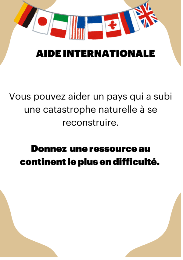 → Les cartes « aide internationale » incitent les joueurs à donner des ressources, richesses et solutions d'adaptation pour équilibrer le jeu. Cela permet aux participants de comprendre en quoi consiste la justice climatique et la solidarité. Vous pouvez choisir de ne pas la jouer.